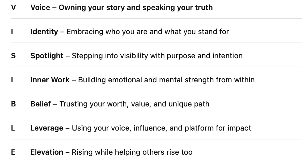 A transformational keynote that walks audiences through the VISIBLE Framework — helping them own their story, align with purpose, and take bold, authentic action. Perfect for leadership conferences, women’s summits, and empowerment events.